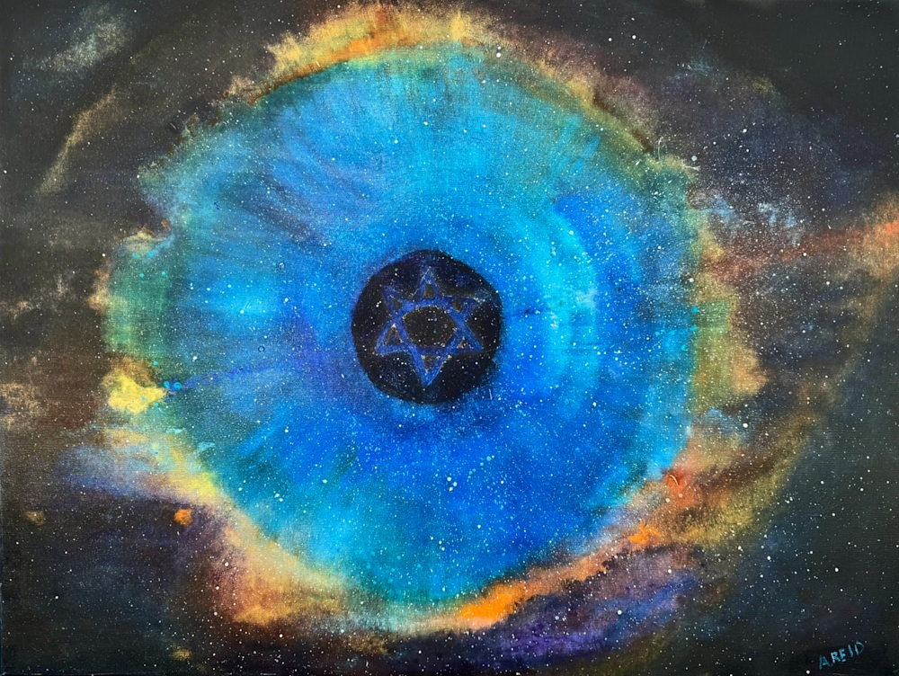 At the center of the composition, your eyes are drawn to a striking black circle, a representation of the The Eternal. This symbol invites contemplation: What do we seek when we look out at the stars? Is it knowledge, wonder, or perhaps a yearning for something greater? The geometrical shapes within echo ancient symbols, further reinforcing the timeless relationship between humanity and the One who flung the stars into space.