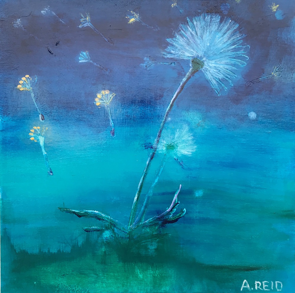 This piece is an abstract celebration of botanical forms, weaving together ethereal elements with a dreamy color palette. The blossoms emerge gracefully against swirling twilight blues and gentle aquas, revealing a world suspended between what is visible and what lies beyond. In each flower, we find a reminder—each whispering a story of resilience and transformation, demonstrating how even our current suffering may seem light in the eternal perspective.